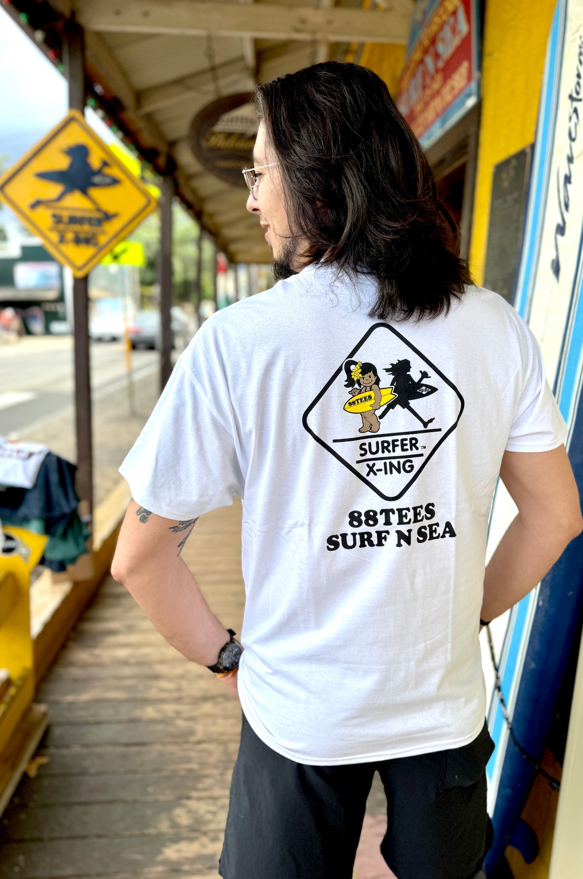 Surf N Sea & 88 Tees collaboration Back again! Only for a limited time. Exclusive collaboration featuring our signature Surfer X-ing logo and the 88 Tees hula girl 100% Cotton Available in Mens, Womens and Kids Standard Fit